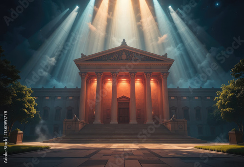 Illuminated Neoclassical Building with Dramatic Night Sky and Spotlight Beams