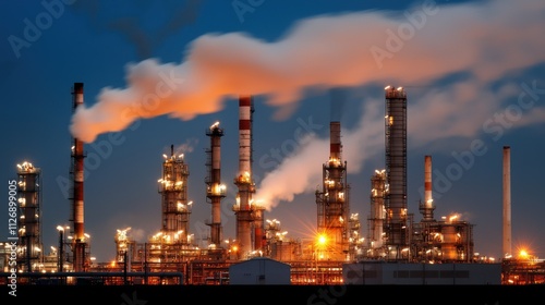 Illuminated oil refinery at night industrial location high-resolution urban environment wide angle energy production concept