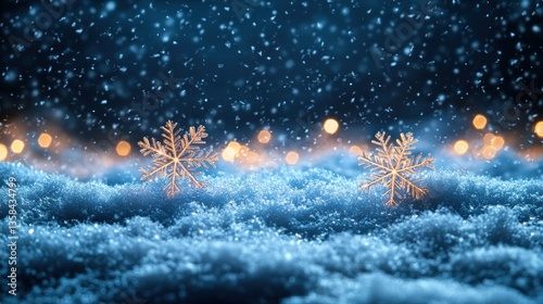 Illuminated snowflakes in snowy night scene with bokeh lights.
