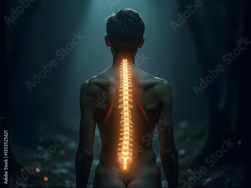 Illuminated Spine Winding Through the Darkness: A glowing human spine shining through the skin of the back, with each vertebra casting a faint ethereal light in a mysterious dark setting.