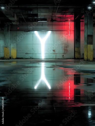 Illuminated Symmetry: A striking neon light installation casts its luminous glow upon the dark, wet surface of an industrial interior, showcasing a perfect mirror reflection.