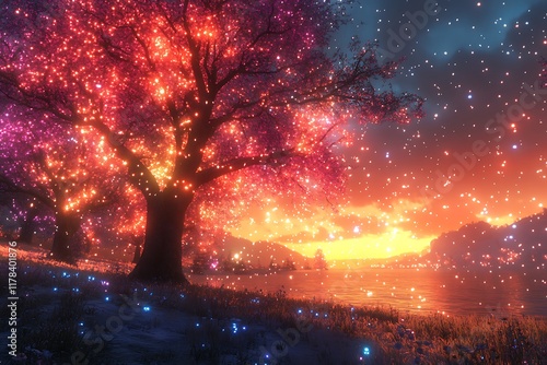 Illuminated Tree by Water at Sunset Magical Scene