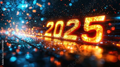 Illuminated year "2025" in glowing red and gold, with vibrant beams of light shooting outward, set against a black backdrop with shimmering stars and futuristic energy swirling around.