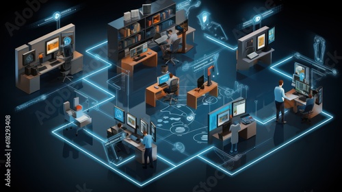 Illustrate a scene depicting robust network security measures, such as firewalls, intrusion detection systems, and encrypted communications