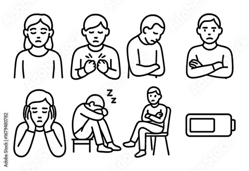 Illustrated emotions and fatigue in monochrome style with diverse male and female figures