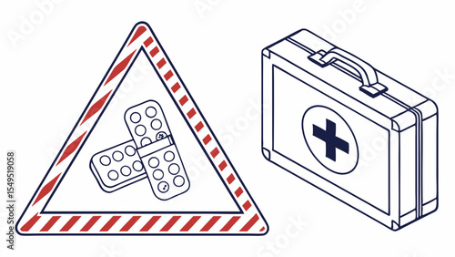 Illustrated First Aid Kit and Warning Sign with Pills.