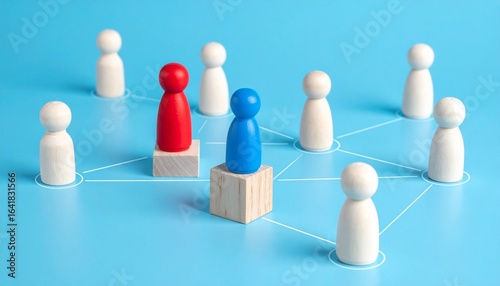 Illustration depicting network of wooden figurines with some highlighted, symbolizing connection and communication. The central figure is in focus.