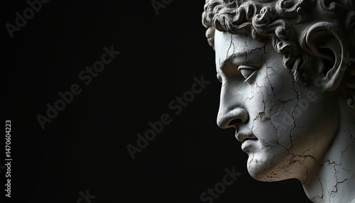 Illustration depicts classical Roman sculpture head. Stoic face with fine cracks texture. Profile against a black background. Antique statue, historical relic, shows history and art.