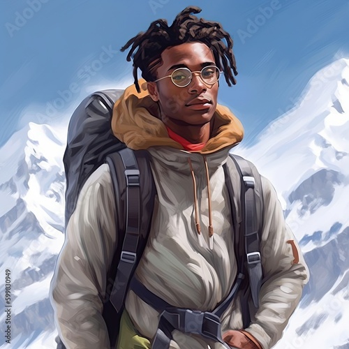 Illustration of a backpacker man and abstract art, AI Generated