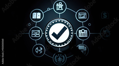 Illustration of a check mark surrounded by icons on a dark background with light effects