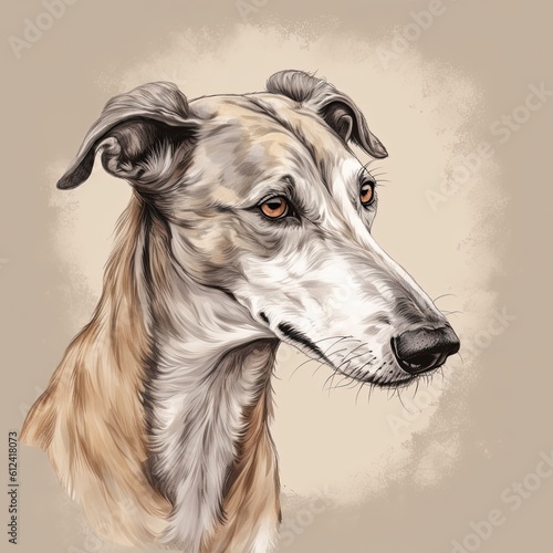 Illustration of a drawing of a greyhound in light gray and beige tones, hand-painted details. Generative AI