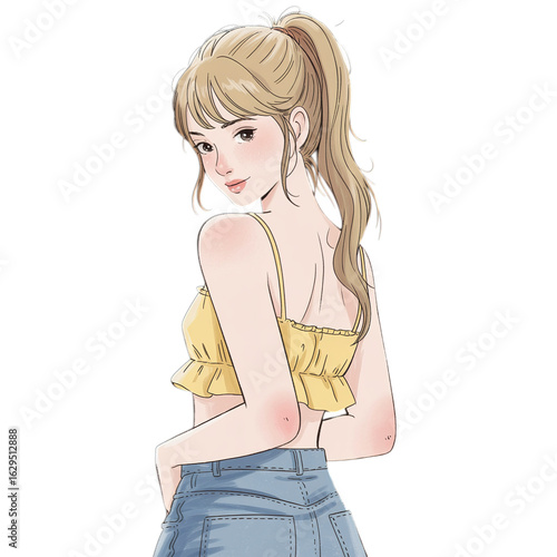 Illustration of a girl in a yellow top and blue jeans looking back