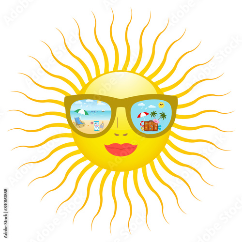 Illustration of a joyful sun in glasses with reflection of rest on a white background.