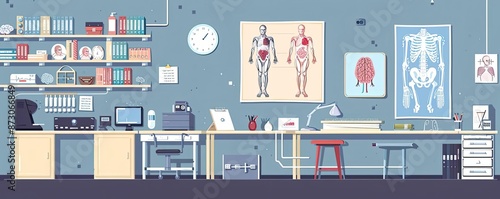 Illustration of a modern medical laboratory with anatomy posters, equipment, and workstations, showcasing a well-equipped research environment.