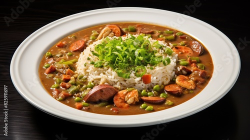 Illustration of a rich and flavorful gumbo sample, with a wooden plate and table in the background