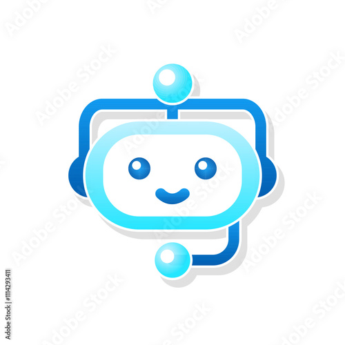 Illustration of a smiling robot face in a minimalist, futuristic design. The blue and white color scheme, rounded edges, and circuitry details create a friendly, modern aesthetic.