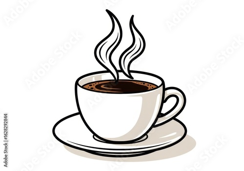 Illustration of a steaming cup of coffee on a saucer, isolated on white