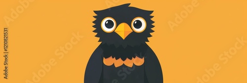 Illustration of a Stylized Black Cartoon Owl with Big Eyes and Bright Orange Beak on Vibrant Yellow Background Displaying a Playful Expression