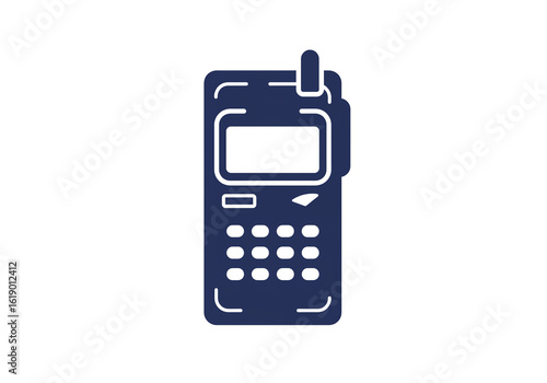 Illustration of a vintage mobile phone with antenna and keypad in dark blue color