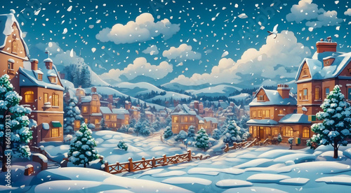 illustration of a Winter village scene. Watercolor card. Generative AI
