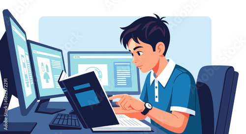 Illustration of a young man working at a computer with a book learning new skills