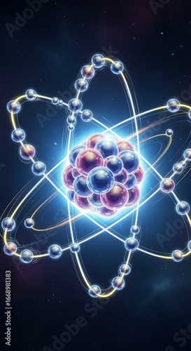 Illustration of an atom model with nucleus and orbiting electrons