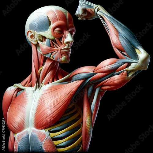 Illustration of anatomy of a human upper arm muscle while flexing on a black background.