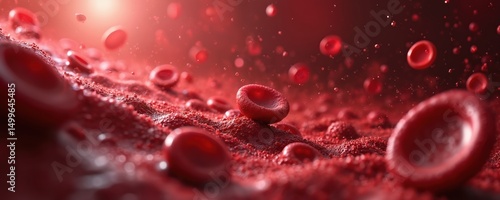 Illustration of blood cells, erythrocytes, in a macro shot. Red blood cells float through plasma. Medical, science, biology, healthcare themes. Blood cells, red blood cells, platelets, blood donation.