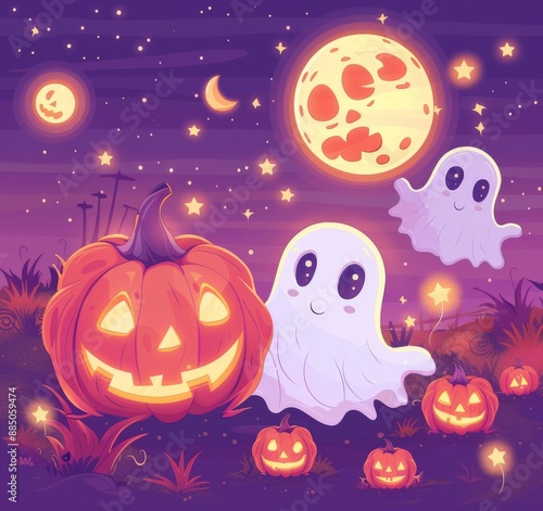 illustration of cartoon cute pumpkins, moon and ghost on purple background for Halloween festival design.