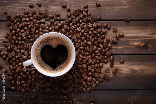 Illustration of coffee cup and scattered coffee beans, wooden background. Generative AI