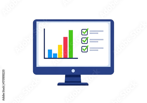 Illustration of computer screen showing bar chart and checklist isolated on transparent background
