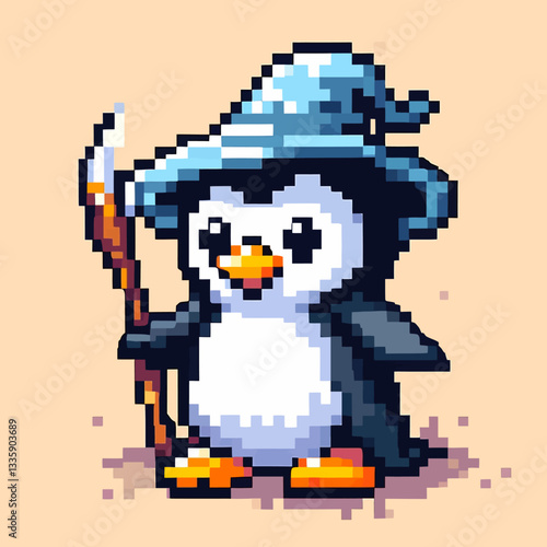 Illustration of cute penguins in the Arctic in a pixel cartoon kawaii vector style on a transparent isolated clipart background, perfect for design and creative projects.