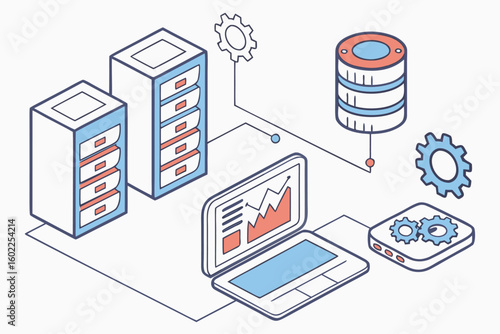 Illustration of data management showing a laptop, servers, gears, and database with graphical data representation and network connections