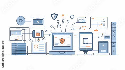 Illustration of EDR (Endpoint Detection and Response) Cybersecurity Technology Demonstration – Central Security System Analyzing and Responding to Threats in Real-Time Across Multiple Devices