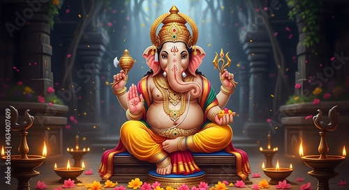 Illustration of lord ganesha seated with offerings and lamps in a temple setting with flower petals