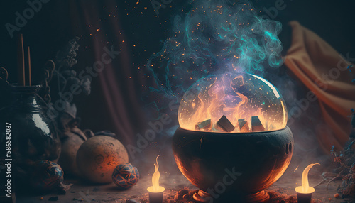 Illustration of magic crystal ball or glowing fortune teller sphere. Mystic background concept. AI generative image.