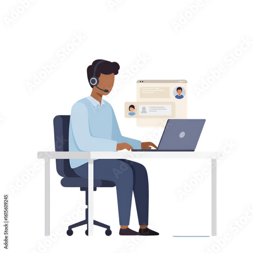 Illustration Of Man Working With Laptop In A Call Center With Black Background
