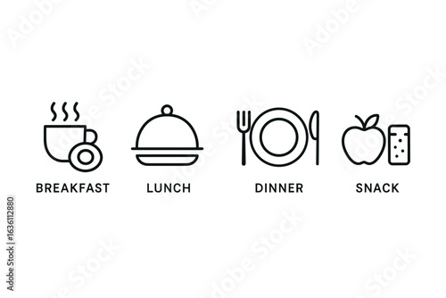 Illustration of meal icons: breakfast, lunch, dinner, snack with simple black line art