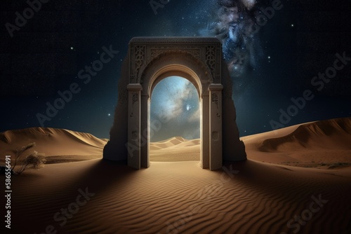 Illustration of mystical stone portal in the desert, fantasy and fiction concept. Generative AI
