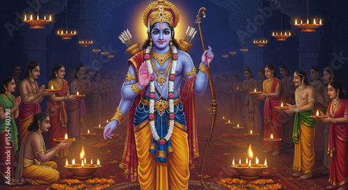 Illustration of rama with bow and arrow surrounded by people holding oil lamps in a dark setting
