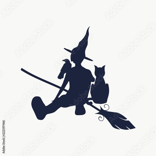 Illustration of sitting young witch. Witch silhouette with a broomstick, cat and raven. Halloween relative image