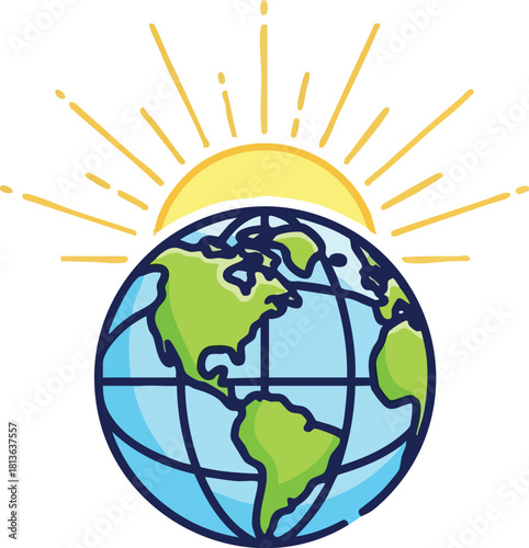 Illustration of the Earth with continents and oceans, with the sun shining brightly above it.