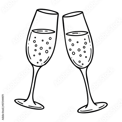 Illustration of two toasting champagne glasses with bubbles for celebratory occasions. Vector hand-drawn doodle illustration