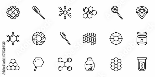 Illustration of various chemical structures, containers, and geometric shapes in a line art style