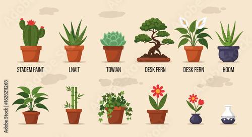 Illustration of various potted plants including cactus, aloe vera, bonsai and flowering plants in pots