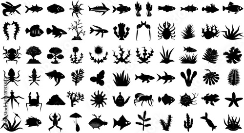 Illustration of various sea creatures and plants in black silhouette against a white background design element