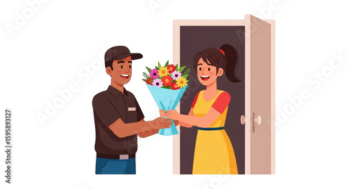 Illustration showing a scene of flower delivery to happy woman 1, featuring Art, Present, Happy, Order.