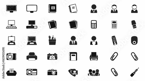 Illustration showing various office supplies and equipment in black and white silhouette style design