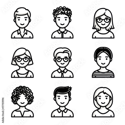 Illustration shows collection of nine different person avatars with various hairstyles, clothes, and accessories like glasses on a transparent background