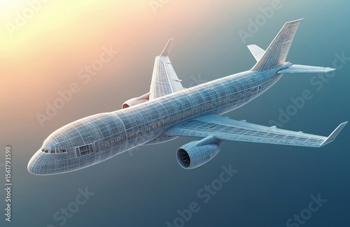 Illustration shows futuristic wireframe airplane against gradient sky. Modern aircraft mesh structure, geometric design, digital art, precise tech illustration for flight, aviation concept. Advanced